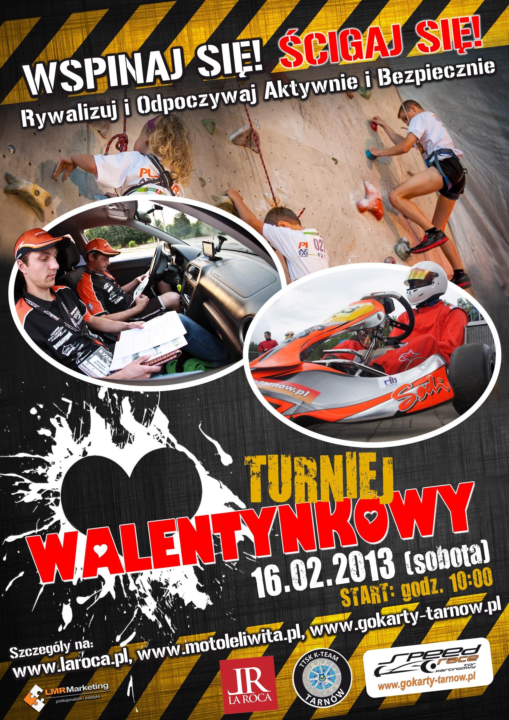 Ścianka Wspinaczkowa La Roca, Tor Kartingowy Speed Race i TTSK K-Team Tarnów są inicjatorem akcji Wspinaj się! Ścigaj się! Rywalizuj i Odpoczywaj, Aktywnie i Bezpiecznie w ramach, której zapraszamy na TURNIEJ WALENTYNKOWY; 16.02 2013 sobota, start o godzinie 10:00