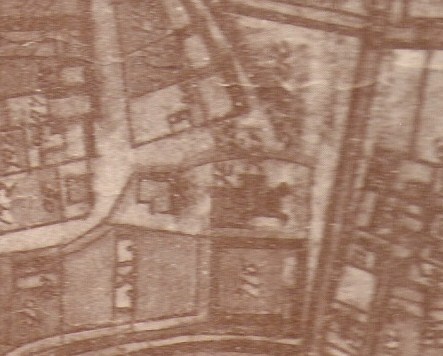 Załączam skan (przepraszam za jakość) fragmentu mapy F. Grottgera. Widać kościół, przy nim jakiś budynek, wokół ogrodzenie z dzwonnicą w narożniku. Południowym skrajem placu płynie Młynówka.