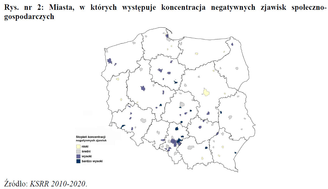 do kumulacji negatywnych zjawisk społeczno-gospodarczych, przestrzennych i środowiskowych powiązanych z degradacją fizyczną zabudowy. Degradacja tych obszarów związana jest często ze skutkami ich długotrwałego użytkowania w celach przemysłowych, z zamieraniem tradycyjnych gałęzi gospodarki lub z ich restrukturyzacją. Utrata dotychczasowych funkcji społecznogospodarczych pełnionych przez miasta lub ich dzielnice prowadzi do pogłębiania występujących problemów: spadku poziomu przedsiębiorczości, wzrostu bezrobocia, pogorszenia jakości infrastruktury, a także intensyfikacji problemów społecznych związanych z depopulacją oraz występującą koncentracją patologii i ubóstwa.