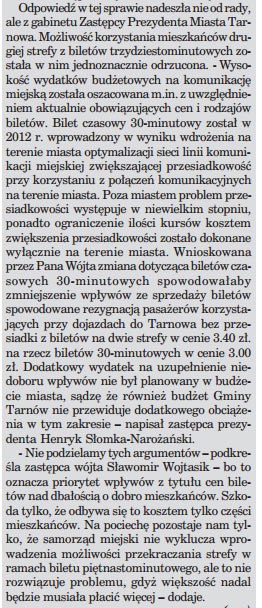 Jeśli gmina bawi się w takie podchody to H.Słomka-Narożański moim skromnym zdaniem powinien użyć innych słów (że miasto jest otwarte na propozycje i bardzo chętnie, jeśli gmina Tarnów na to wyłoży kasę w ramach corocznej dotacji do MPK) odpisał, że wydatek ten nie był planowany w budżecie miasta na ten rok i wg niego budżet gminy chyba też nie przewiduje dodatkowego obciążenia. Aparat propagandowy gminy to podchwycił i piszą że: "możliwość korzystania z biletów (...) została jednoznacznie odrzucona"... Dla kogoś ze wsi kto nie przeczyta dokładnie tego artykułu zostaje w pamięci: miasto nie zgadza się na bilety czasowe dla nas.